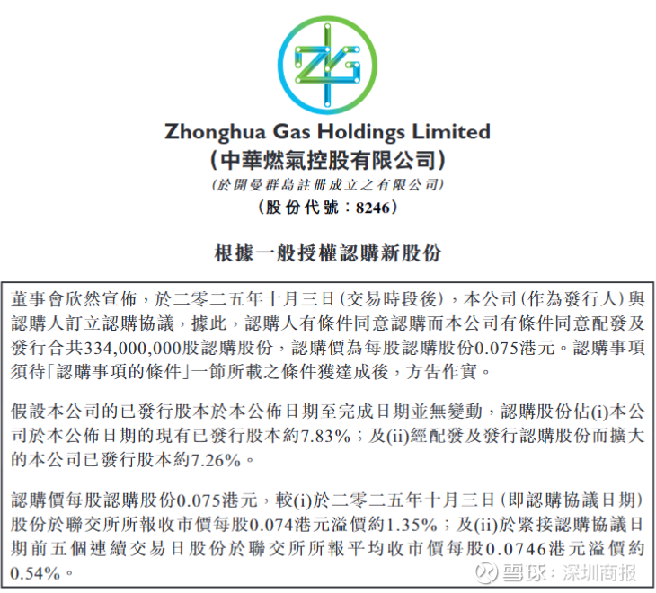 10月5日,中华燃气(08246.HK)发布公告称,公司于2025年10月3日(交易时段后),与认购人订立认购协议。