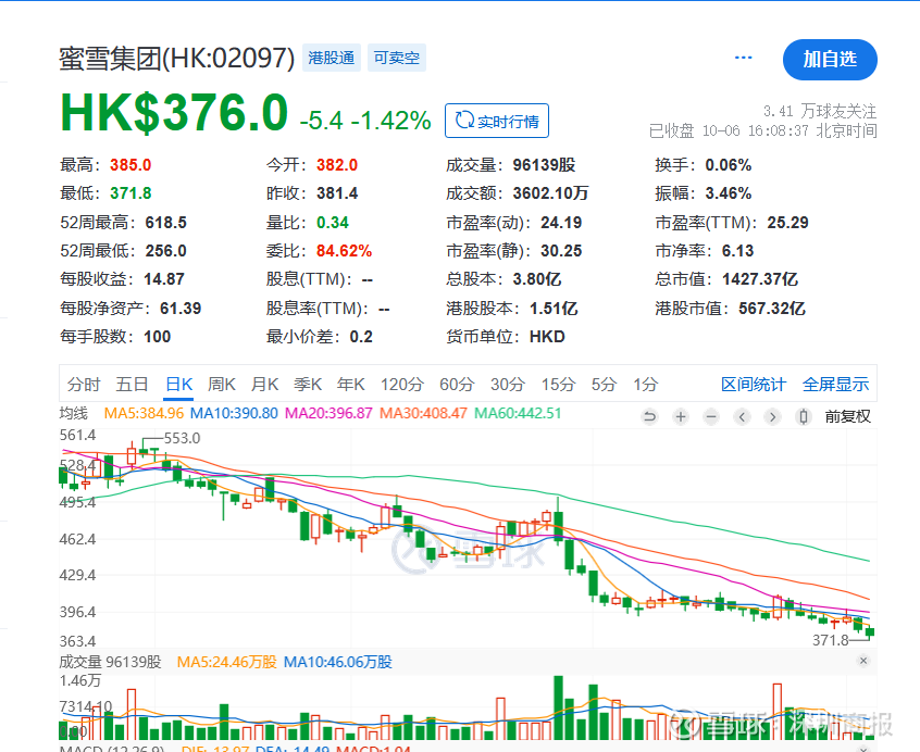 截至10月6日港股收盘,蜜雪集团(2097.HK)股价报376港元/股,当日下跌1.42%。拉长时间线来看,在过去的三个月里,蜜雪集团股价已下跌四成,市值缩水至1427亿港元,较今年7月初已蒸发500亿港元。