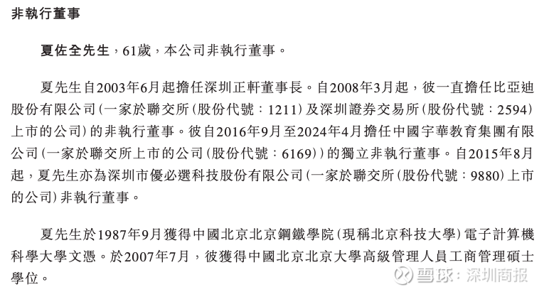 招股书显示,夏佐全,61岁,安诺优达非执行董事。自2008年3月起,一直担任比亚迪股份有限公司非执行董事。同时,夏佐全还担任深圳正轩董事长、优必选非执行董事。此外,自2016年9月至2024年4月,其还担任宇华教育的独立非执行董事。