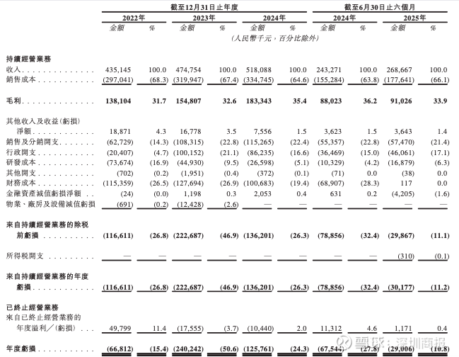 2022年、2023年、2024年和2025年上半年(下称报告期),安诺优达营收分别为4.35亿元、 4.75亿元、5.18亿元和2.69亿元(人民币,下同);毛利分别为1.38亿元、1.55亿元、1.83亿元和0.91亿元;毛利率分别为31.7%、32.6%、35.4%和33.9%;年度亏损分别为0.67亿元、2.4亿元、1.26亿元和0.29亿元,年内亏损率分别为15.4%、50.6%、24.3%和10.8% 。