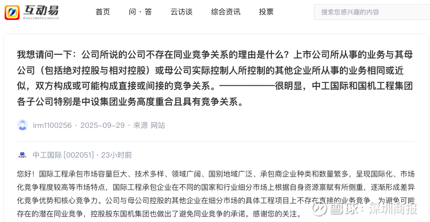 有投资者提问直击要害:”公司所说的公司不存在同业竞争关系的理由是什么?上市公司所从事的业务与其母公司(包括绝对控股与相对控股)或母公司实际控制人所控制的其他企业所从事的业务相同或近似,双方构成或可能构成直接或间接的竞争关系——很明显,中工国际和国机工程集团各子公司特别是中设集团业务高度重合且具有竞争关系。“