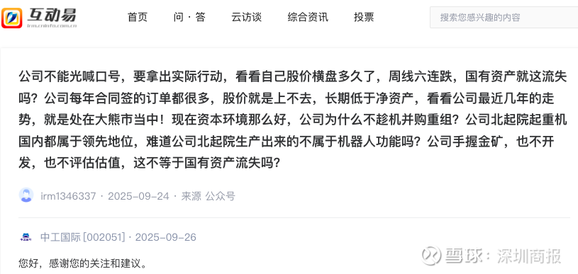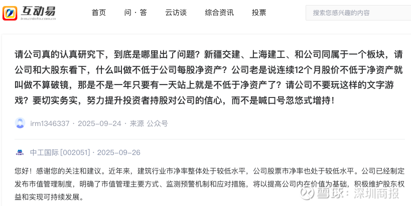 近期,在深交所互动易平台上,中期业绩表现不尽如人意的中工国际(002051)被投资者密集提问,主要聚焦于否存在同业竞争关系、股价表现和市值管理等方面,对此,公司做了正面回应。