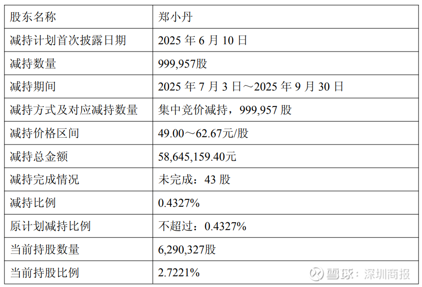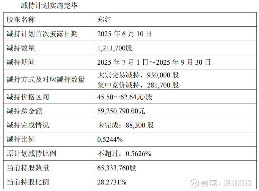 公告显示,本次减持计划实施前,郑红持有公司股份66,545,460股,占公司总股本的28.7975%;郑小丹女士持有公司股份7,290,284股,占公司总股本的3.1549%。