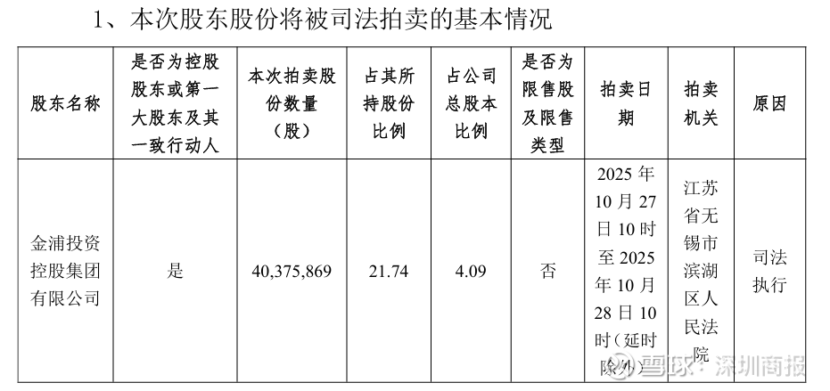 值得注意的是,9月25日晚间,金浦钛业公告,近日,公司通过控股股东金浦集团获悉,因案件执行需要,江苏省无锡市滨湖区人民法院将于2025年10月27日10时至2025年10 月28日10时(延时除外)在京东司法拍卖网络平台对金浦集团持有的金浦钛业4038万股无限售流通股进行第一次公开拍卖,起拍价为9383万元,加价幅度为15万元。据公告,本次司法拍卖系因申请执行人宁波海广资产管理有限公司与被执行人金浦集团债务纠纷。