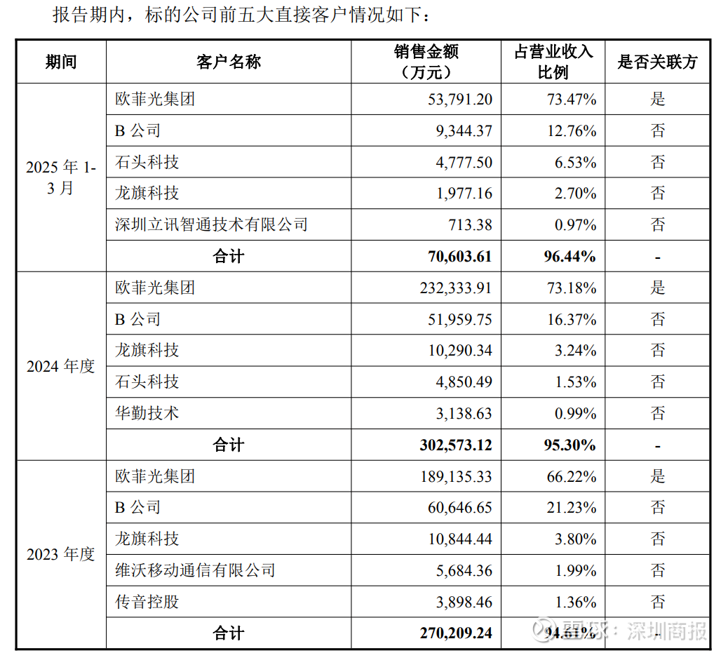 财务数据显示,标的公司欧菲微电子存在客户集中度较高的风险。2023年、2024年和2025年一季度,将上市公司及其子公司从标的公司采购后未经加工直接对外销售部分的产品穿透至外部客户后,标的公司对穿透后前五大客户的销售额占营业收入的比例分别为79.40%、78.30%、79.29%,主要包括国际国内头部智能手机品牌厂商等。而报告期内欧菲光均为欧菲微电子第一大直接客户,销售占比分别为66.22%、73.18%、73.47%。