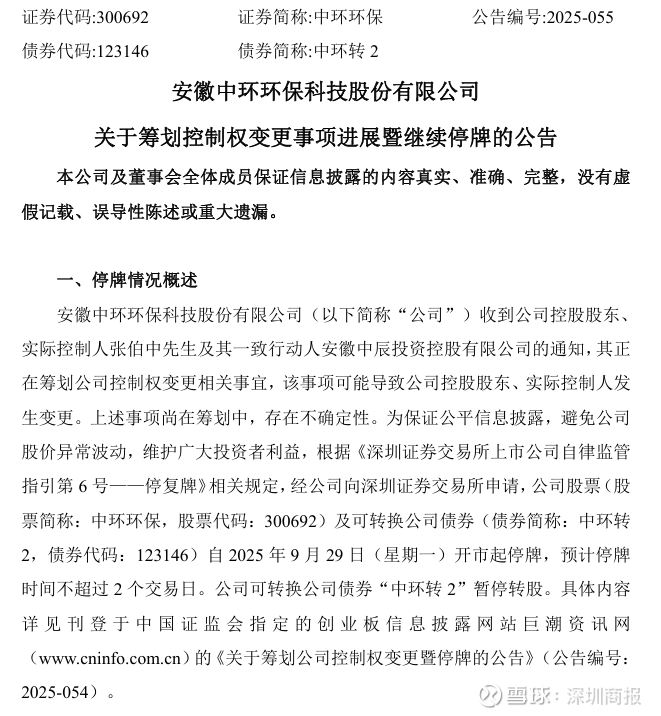 10月8日,中环环保(300692)发布公告,控股股东、实际控制人张伯中及其一致行动人正在筹划公司控制权变更相关事宜,该事项可能导致公司控股股东和实际控制人发生变更。为避免股价异常波动,维护投资者利益,公司自2025年9月29日起停牌,预计停牌时间不超过2个交易日。
