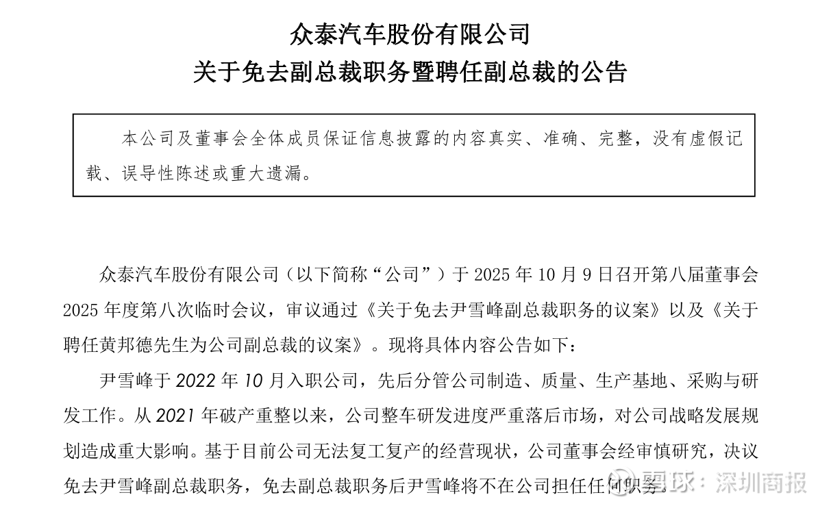 10月9日晚间,众泰汽车(深市代码:000980)公告称,公司于2025年10月9日召开第八届董事会2025年度第八次临时会议,审议通过《关于免去尹雪峰副总裁职务的议案》以及《关于聘任黄邦德先生为公司副总裁的议案》。