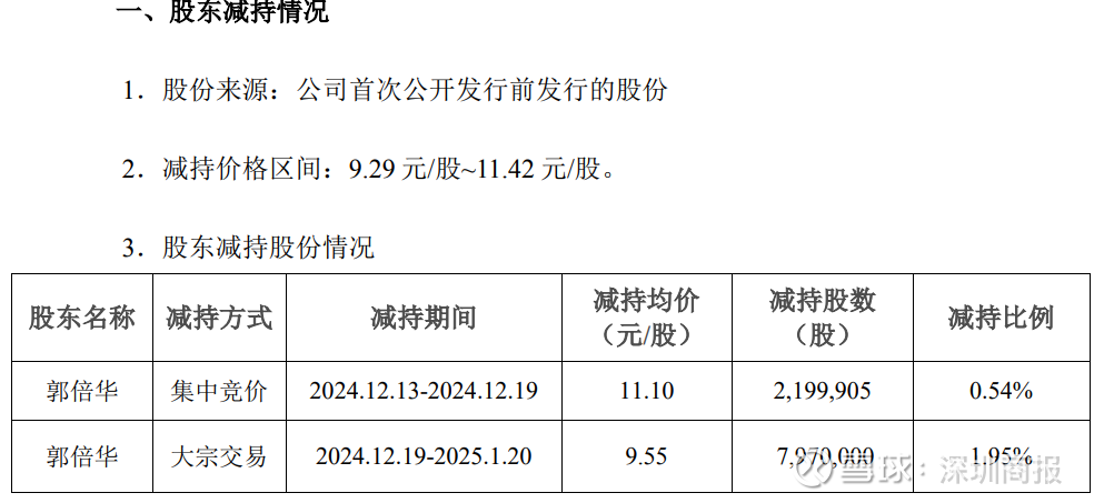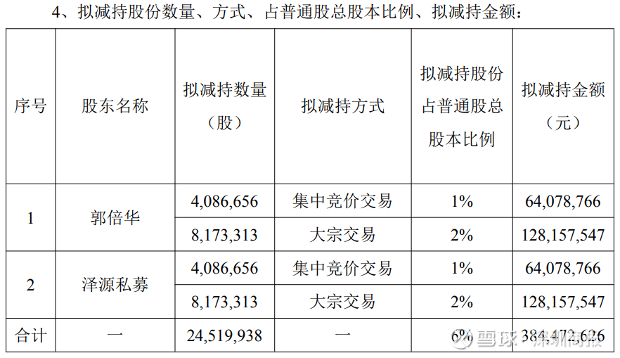 公告显示,侨银股份控股股东、实际控制人之一郭倍华持有公司股份1.23亿股(占公司总股本的30.22%),股东深圳泽源私募证券基金管理有限公司-泽源利旺田42号私募证券投资基金,持有公司股份2045万股,占公司总股本的5%。郭倍华、泽源私募计划自公告披露之日起15个交易日后的三个月内,即2025年 11 月 3 日起至 2026 年 2 月 2 日止,均分别以大宗交易方式减持公司股份不超过817.33万股(不超过公司目前总股本的2%)和以集中竞价交易方式减持公司股份不超过408.67万股(不超过公司目前总股本的1%)。