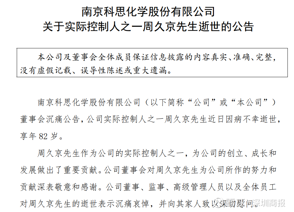 10月10日晚间,科思股份(300856)董事会沉痛公告,公司实际控制人之一周久京先生近日因病不幸逝世,享年82岁。
