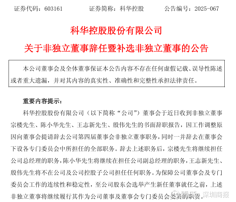 10月10日,科华控股(603161)发布公告,因工作调整原因,宗楼、陈小华、王志新和殷伟提请辞去公司非独立董事职务,同时一并辞去在董事会下设各专门委员会中所担任的全部职务。