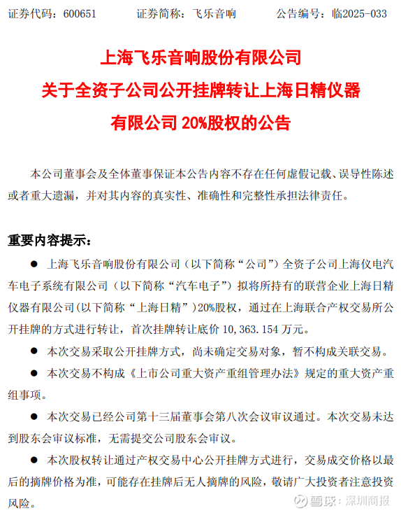 飞乐音响(600651)10月10日公告,全资子公司上海仪电汽车电子系统有限公司拟将所持有的联营企业上海日精仪器有限公司(简称“上海日精”)20%股权,通过在上海联合产权交易所公开挂牌的方式进行转让,首次挂牌转让底价1.04亿元。