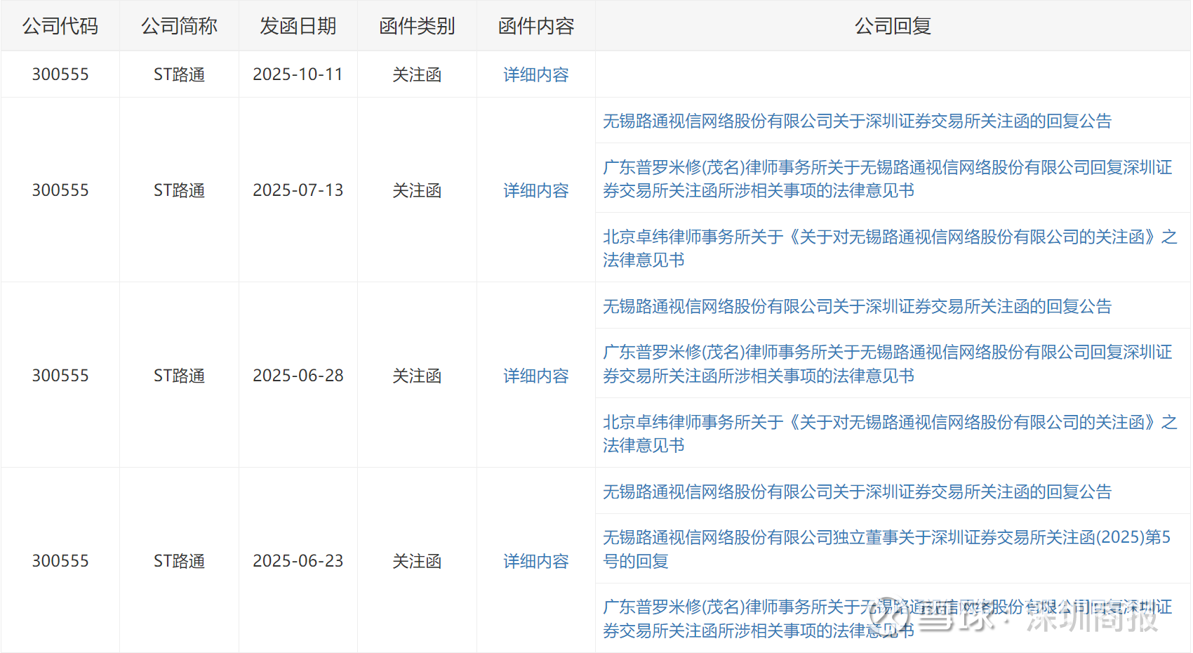 10月11日,深交所向ST路通(300555)发出关注函。值得一提的是,今年6月份以来,ST路通已先后4次收到深交所关注函。