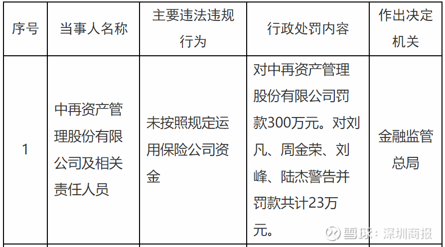 10月11日,国家金融监督管理总局发布的行政处罚信息显示,因未按照规定运用保险公司资金,中再资产管理股份有限公司被罚款300万元,相关责任人员刘凡、周金荣、刘峰、陆杰被警告并罚款共计23万元。
