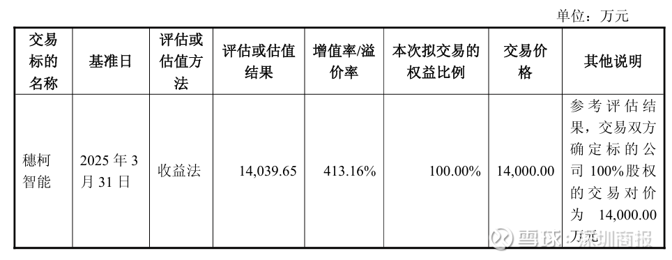 根据中企华出具的《资产评估报告》,标的公司100%股权的评估值为1.4亿元,比截至2025年3月31日经审计的标的公司合并报表归属于母公司所有者权益增值1.13亿元,增值率为413.16%。