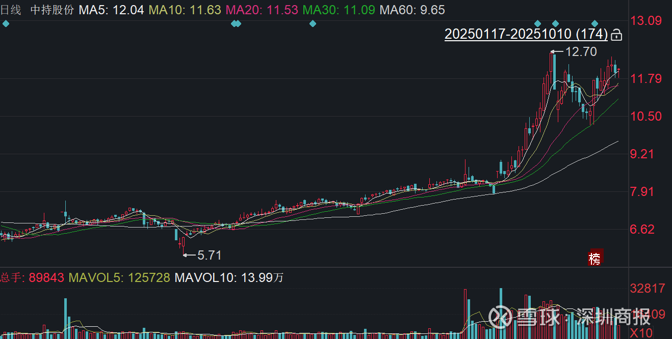 二级市场上,截至10月10日收盘,中持股份上涨1.17%报12.11元/股,最新市值30.92亿元,今年来公司股价累计上涨超88%。