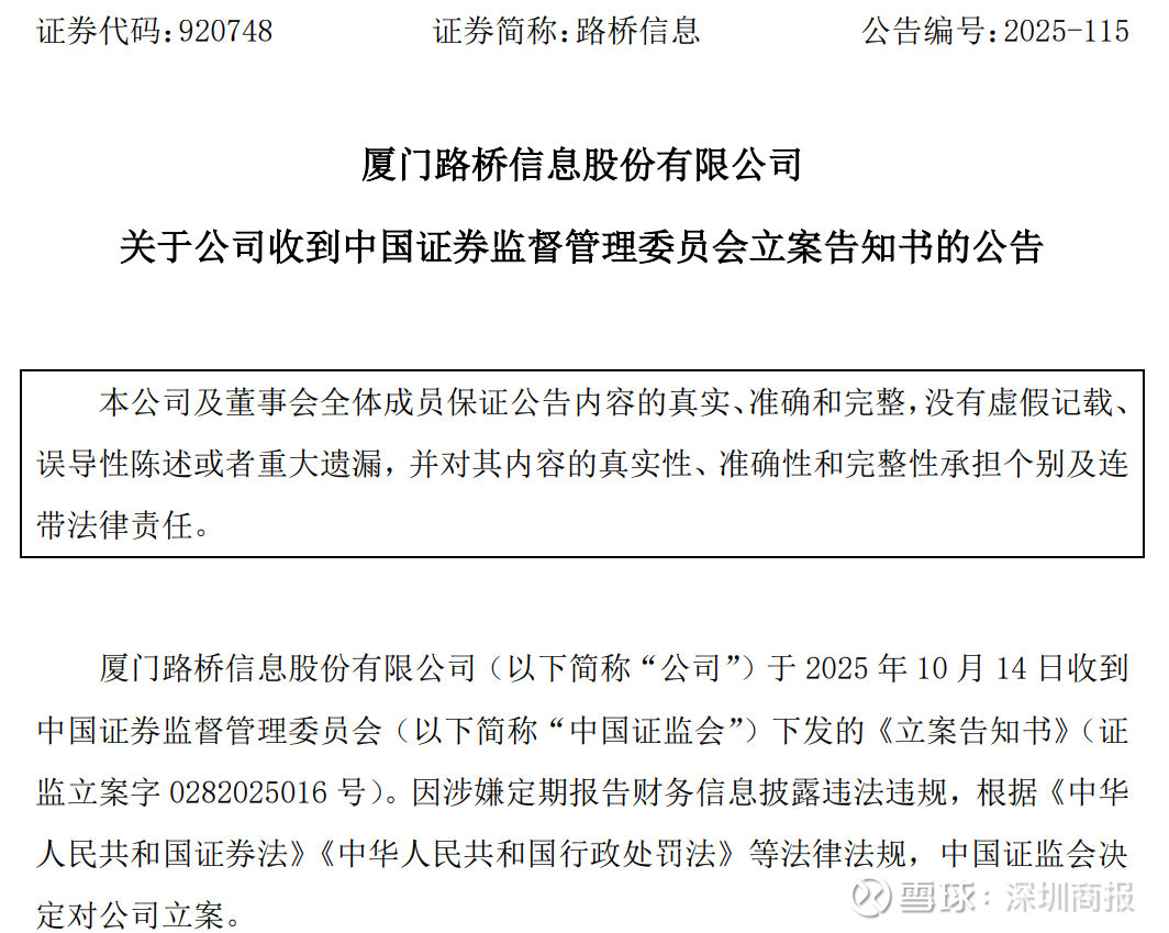 10月14日晚间,路桥信息(920748)发布公告称,公司于2025年10月14日收到中国证监会下发的《立案告知书》。因涉嫌定期报告财务信息披露违法违规,根据相关法律法规,中国证监会决定对公司立案。