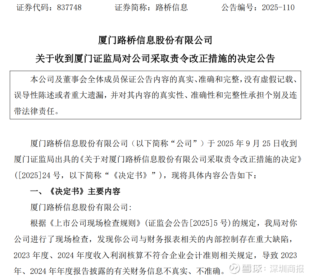 9月29日,路桥信息发布公告称,厦门证监局现场检查发现其与财务报表相关的内部控制存在重大缺陷,2023年度、2024年度收入利润核算不符合企业会计准则相关规定,导致2023年、2024年年度报告披露的有关财务信息不真实、不准确。