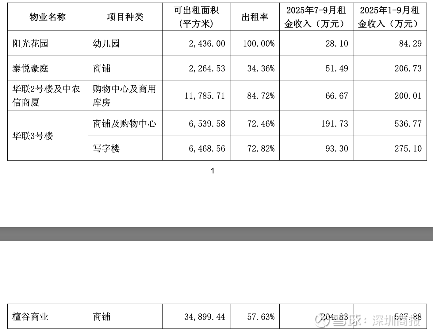 阳光花园幼儿园的可出租面积为2436平方米,出租率为100%,租金收入为28.1万元;泰悦豪庭商铺的可出租面积为2264.53平方米,出租率为34.36%,租金收入为51.49万元;华联2号楼及中农信商厦的可出租面积为1.18万平方米,出租率为84.72%,租金收入为66.67万元;华联3号楼的商铺及购物中心出租率为72.46%,租金收入为191.73万元。