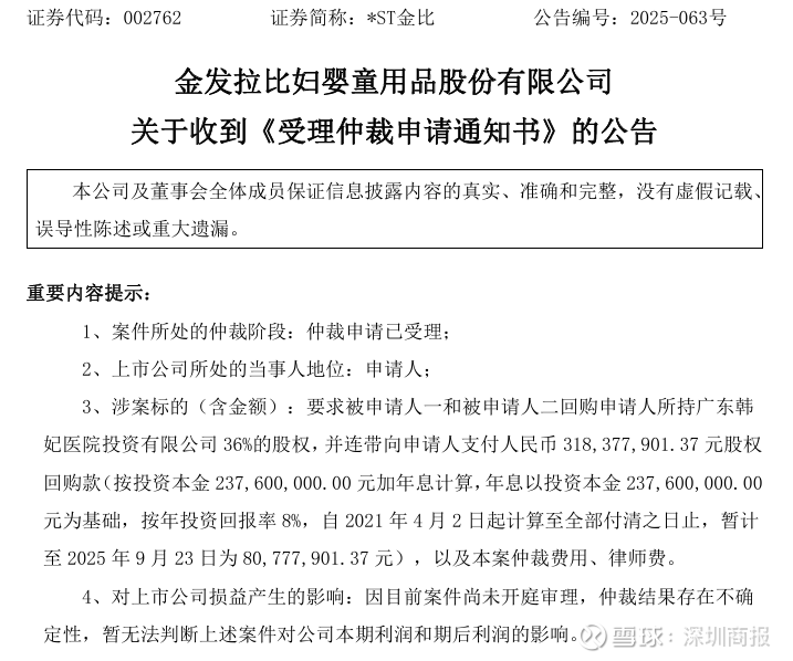 公司作为申请人,已申请仲裁要求被申请人一和被申请人二回购其所持有的广东韩妃医院投资有限公司36%的股权,并支付股权回购款3.18亿元。该金额是基于投资本金2.38亿元加上自2021年4月2日起至2025年9月23日的年息计算,年息为8%。