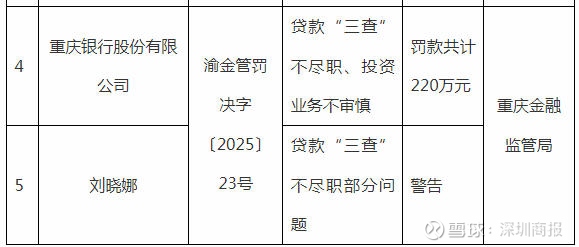 国家金融监督管理总局重庆监管局10月22日披露行政处罚信息公开表,因贷款“三查”不尽职、投资业务不审慎,重庆银行股份有限公司被罚款共计220万元。
