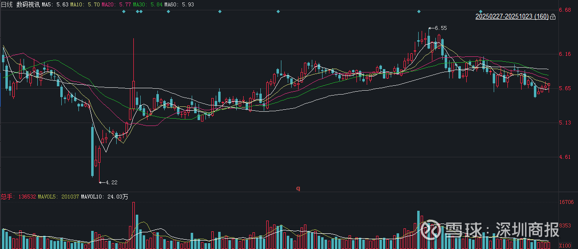 二级市场上,截至23日收盘,数码视讯上涨0.53%报5.71元/股,总市值约81.43亿元,今年来公司股价近乎“原地踏步”。
