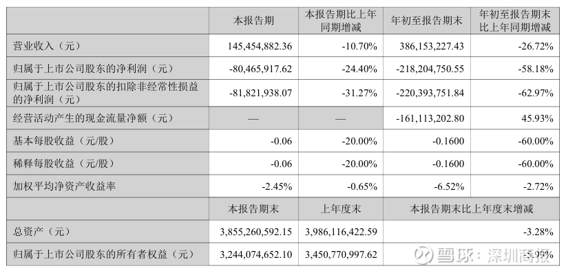 其中第三季度,公司营业收入为1.45亿元,同比下降10.7%;归母净利润自去年同期亏损6468万元变为亏损8047万元,亏损额进一步扩大;扣非归母净利润自去年同期亏损6233万元变为亏损8182万元,亏损额进一步扩大;EPS为-0.0592元。