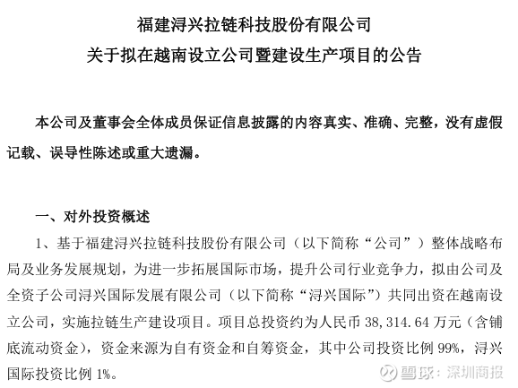 为应对国际贸易环境变化,浔兴股份同日发布公告称,拟投资约3.83亿元在越南建设拉链生产项目。此前,公司还对孟加拉子公司增资1亿元人民币,进一步拓展海外市场。