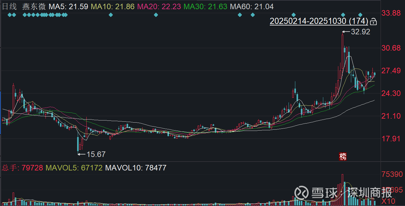 二级市场上,截至30日收盘,燕东微下跌1.33%报26.79元/股,总市值约382.46元,今年来公司股价累计上涨超三成。