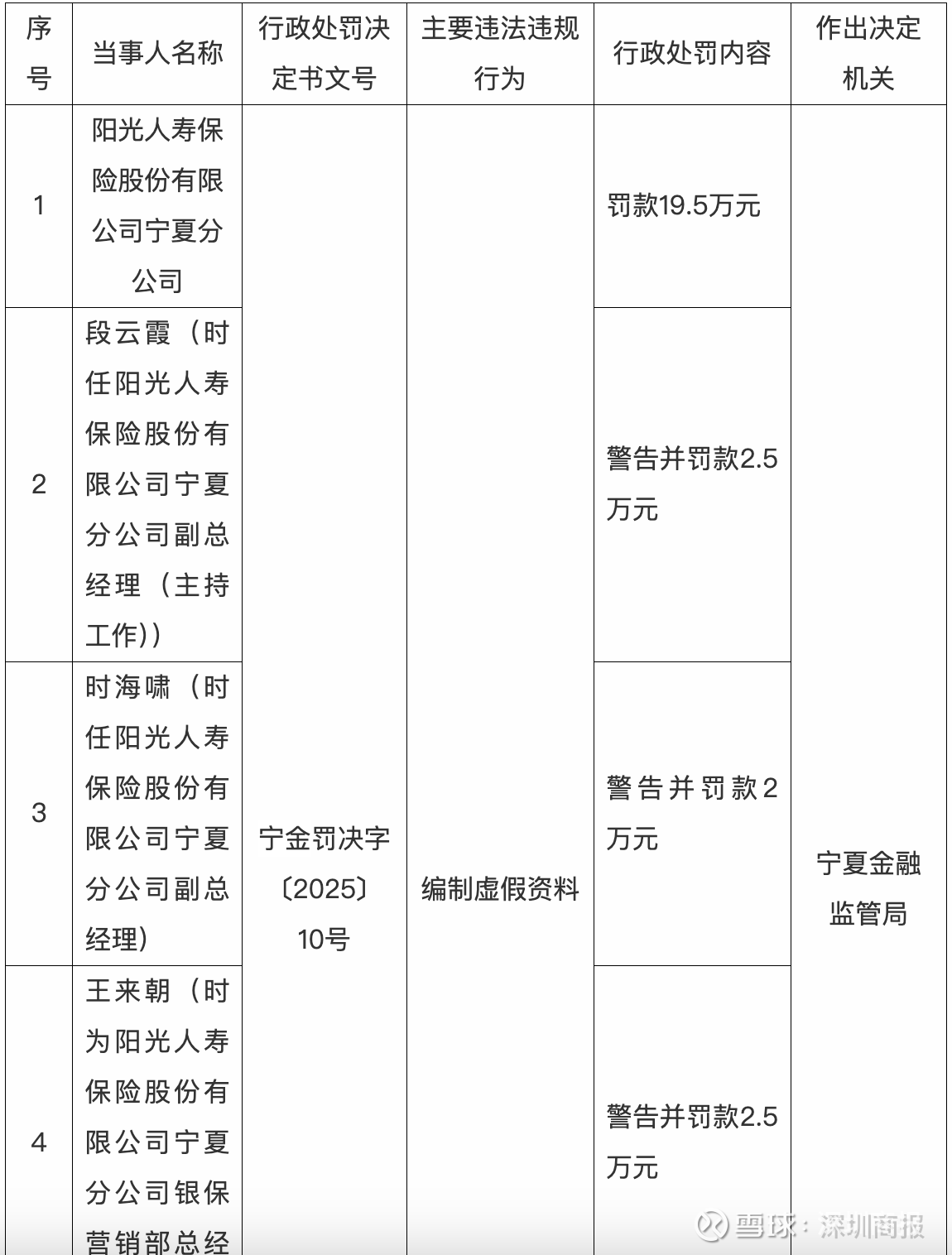 并对时任阳光人寿保险股份有限公司宁夏分公司副总经理段云霞警告并罚款2.5万元,对时任阳光人寿保险股份有限公司宁夏分公司副总经理时海啸警告并罚款2万元,对时为阳光人寿保险股份有限公司宁夏分公司银保营销部总经理王来朝警告并罚款2.5万元,对时为阳光人寿保险股份有限公司宁夏分公司银保营销部总经理钱涛警告并罚款2万元。