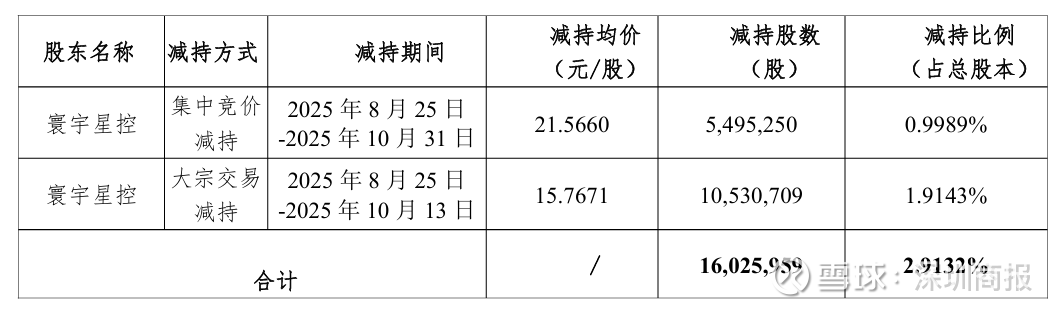公告显示,寰宇星控集中竞价减持均价为21.566元/股,大宗交易减持均价为15.7671元/股,减持总金额约2.85亿元。