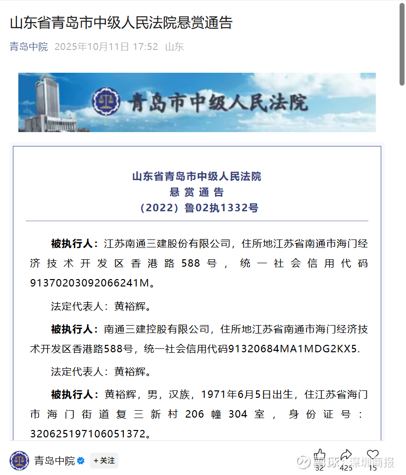 通告显示,被执行人为江苏南通三建股份有限公司、南通三建控股有限公司以及两公司的董事长黄裕辉以及副董事长、董事、监事等高管。未履行金额253519485.58元,凡向青岛市中级人民法院举报被执行人藏匿、转移的财产线索(不含本院已掌握的线索),帮助法院执行到位的,按实际到位执行款10%支付悬赏金。