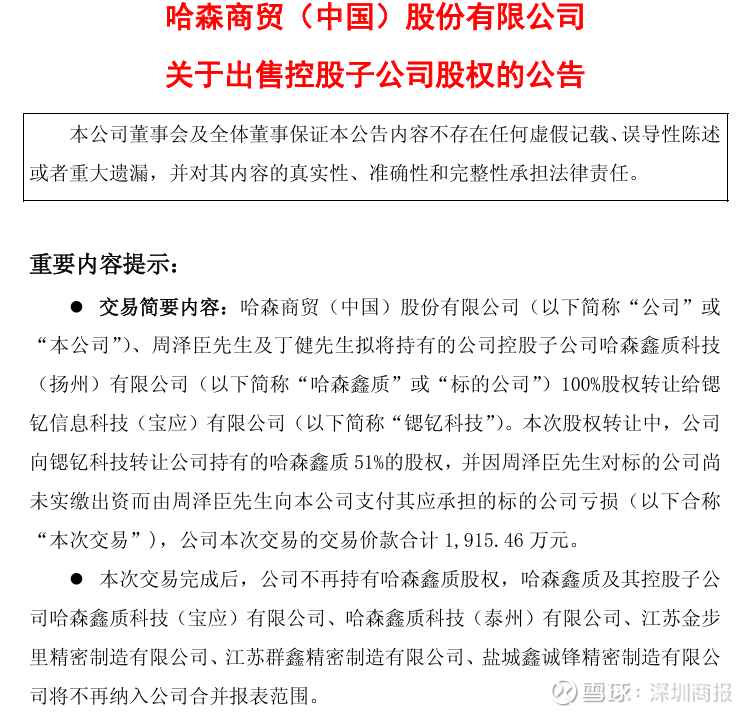 本次交易完成后,公司不再持有哈森鑫质股权,哈森鑫质及其多家控股子公司将不再纳入公司合并报表范围。