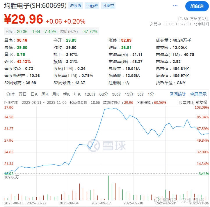 因机器人概念受到市场热捧,均胜电子A股股价在8月20日到9月20日的一个月内翻倍,随后回落。截至发稿,均胜电子A股股价报29.96元/股。