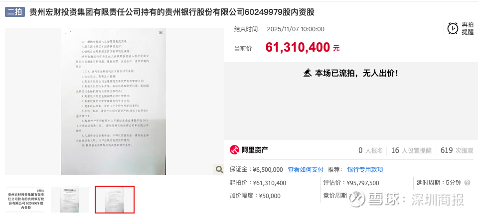 此前,11月6日上午10时,另外一笔约6025万股贵州银行股权在阿里资产交易平台正式开拍,起拍价为6134.04万元,评估价为9579.75万元( 1.59元/股),其首次拍卖的起拍价为7663.8万元(折合每股约1.27元)。尽管起拍价较首次已下调20%,但二次拍卖仍无人问津而流拍。