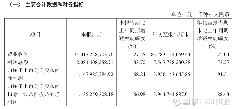 其中第三季度,公司营业收入为270.2亿元,同比上升27.3%;归母净利润为11.5亿元,同比上升68.2%;扣非归母净利润为11.4亿元,同比上升67.0%;EPS为0.249元。