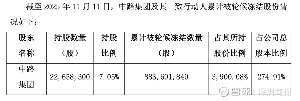 公告披露,公司于2025年11月12日收到公司第一大股东中路集团的告知函,获悉中路集团持有的公司股份被轮候冻结。本次被轮候冻结股份数量