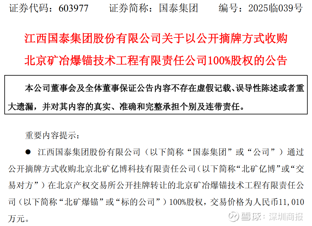 11月13日晚间,国泰集团(603977)公告称,公司通过公开摘牌方式成功收购北京北矿亿博科技有限责任公司(以下简称“北矿亿博”)在北京产权交易所公开挂牌转让的北京矿冶爆锚技术工程有限责任公司(以下简称“北矿爆锚”)100%股权,成交价格为1.101亿元。