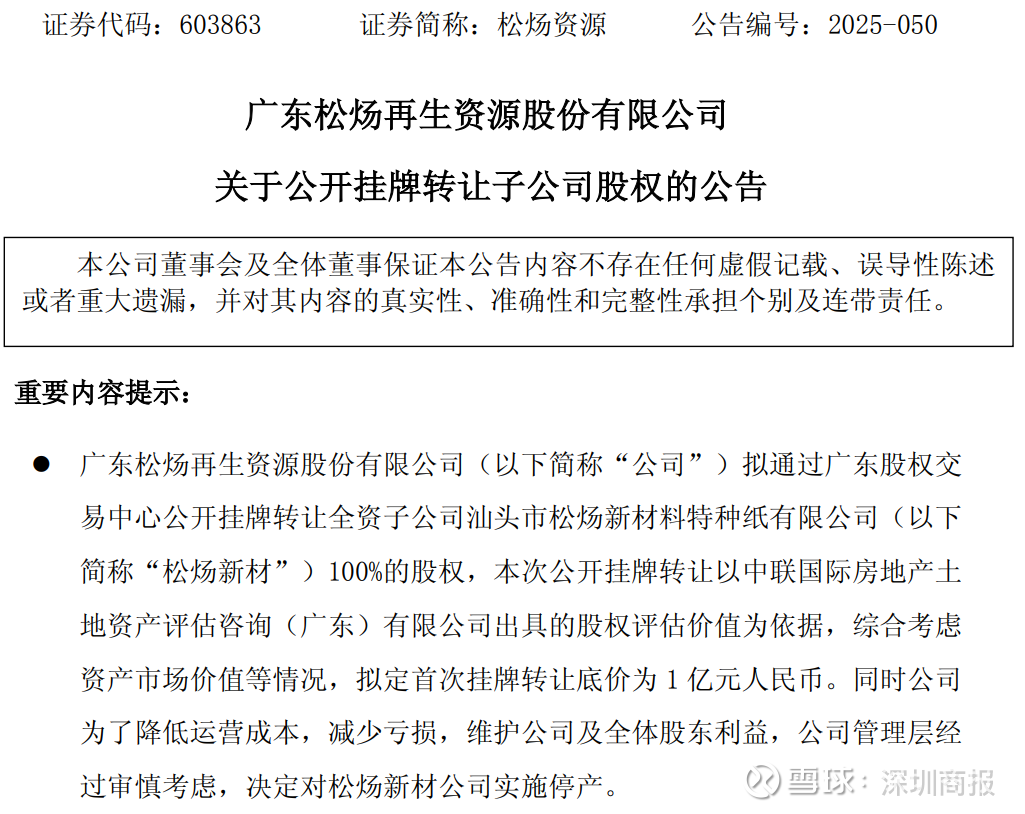 11月14日晚间,松炀资源(603863)公告称,公司拟通过广东股权交易中心公开挂牌转让全资子公司汕头市松炀新材料特种纸有限公司(简称“松炀新材”)100%的股权,拟定首次挂牌转让底价为1亿元。同时公司为了降低运营成本,减少亏损,公司管理层经过审慎考虑,决定对松炀新材实施停产。