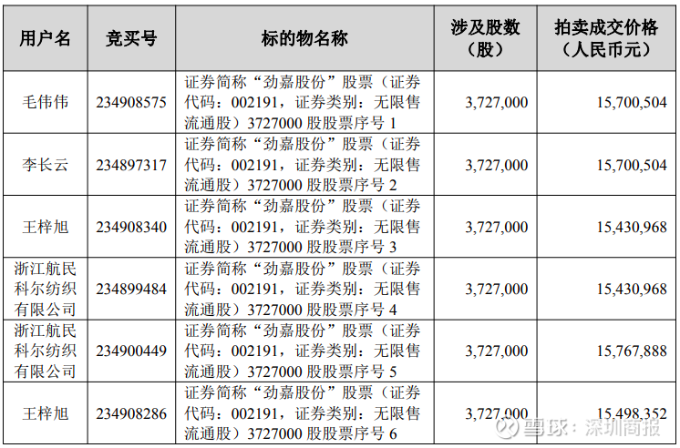 劲嘉股份(002191)11月18日晚间公告称,公司控股股东深圳市劲嘉创业投资有限公司(以下简称“劲嘉创投”或“控股股东”)持有的3727万股股份(占公司总股本2.57%)于2025年11月17日~18日在京东网司法拍卖平台完成拍卖,拍卖成交金额合计1.56亿元。