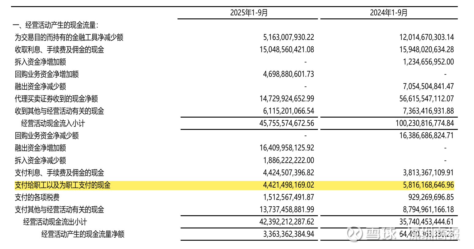 最新财报显示,2025年前三季度,申万宏源支付给职工以及为职工支付的现金为44.21亿元,与上年同期的58.16亿元相比减少约24%。