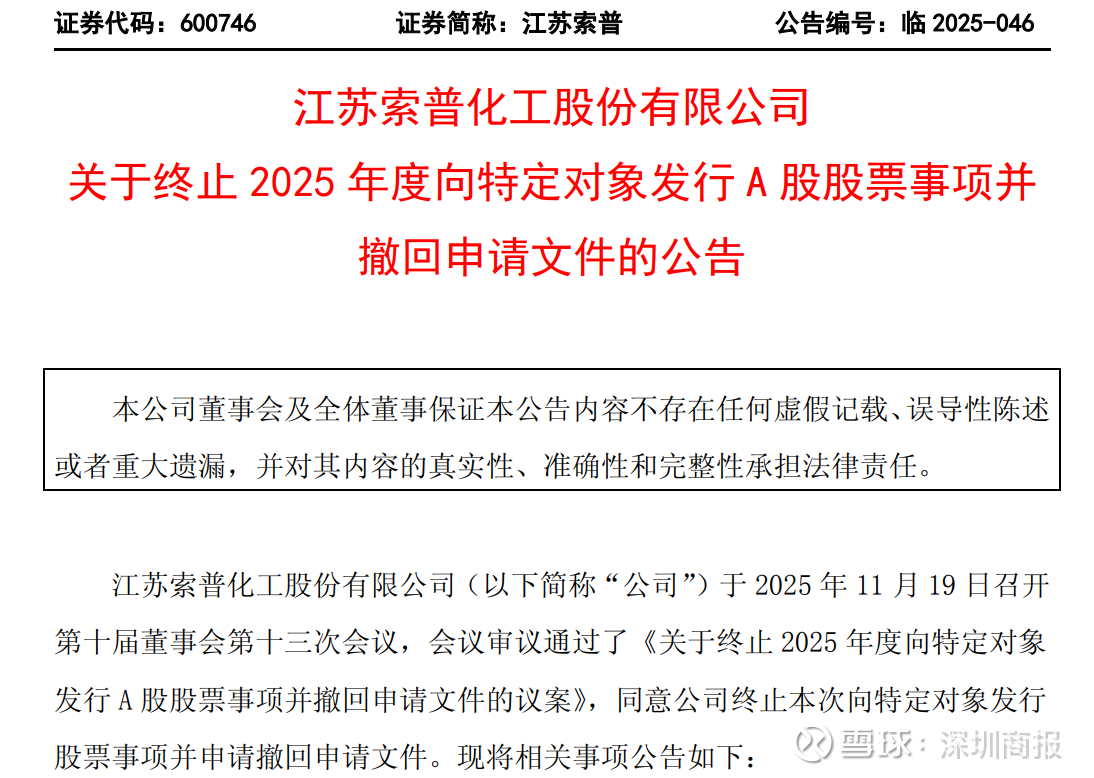 11月19日晚间,江苏索普(600746)发布公告称,综合考虑当前外部环境,结合公司实际情况等因素,经相关各方充分沟通、审慎分析后,公司决定终止本次向特定对象发行股票事项并申请撤回相关申请文件。