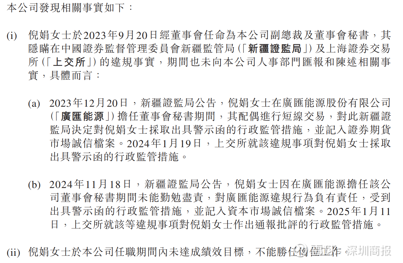 一是倪娟于2023年9月20日经董事会任命为公司副总裁及董事会秘书,其隐瞒在新疆证监局及上交所的违规事实,期间也未向公司人事部门汇报和陈述相关事实。