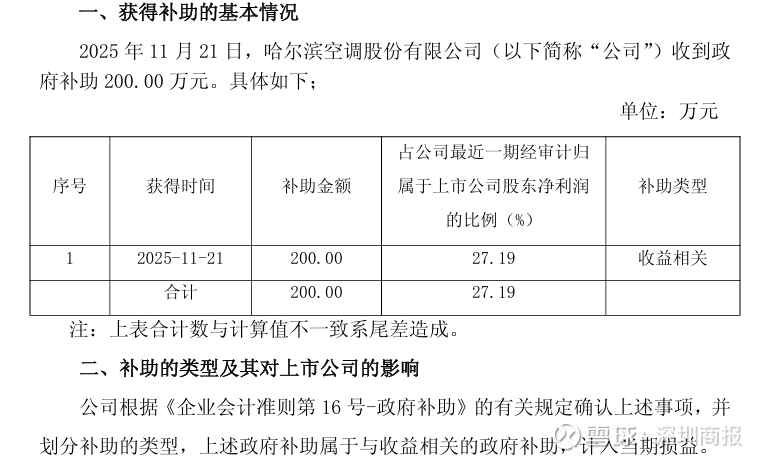 11月21日,哈空调(600202)发布公告,公司于2025年11月21日收到政府补助200万元,该补助金额占公司最近一期经审计归母净利润的27.19%。此次政府补助被划分为与收益相关的类型,计入当期损益。