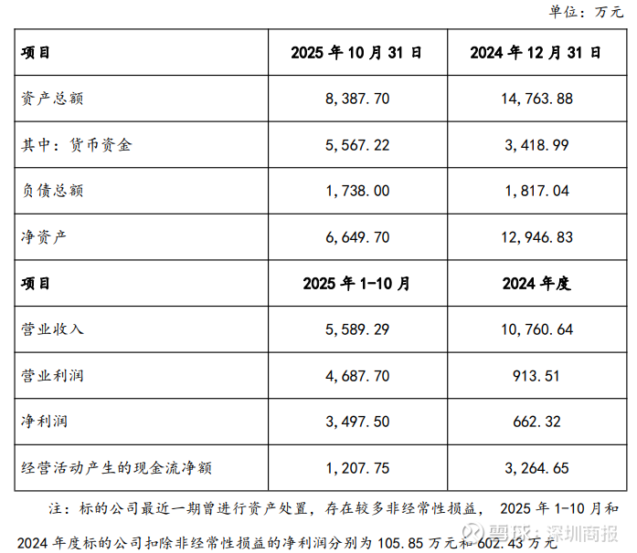标的公司财务数据方面,公告显示,截至2025年10月末,标的公司资产总额8,388万元,资产总额1738万元,资产负债率约21%,净资产6,650万元,货币资金5,567万元,账面现金流相对充裕。2024年及2025年1-10月,佛山智强分别实现营业收入1.076亿元、0.5589亿元;净利润662万元、3,498万元,但标的公司最近一年曾进行资产处置,存在较多非经常性收益,2024年及2025年1-10月,公司扣非后净利仅602万元、106万元。