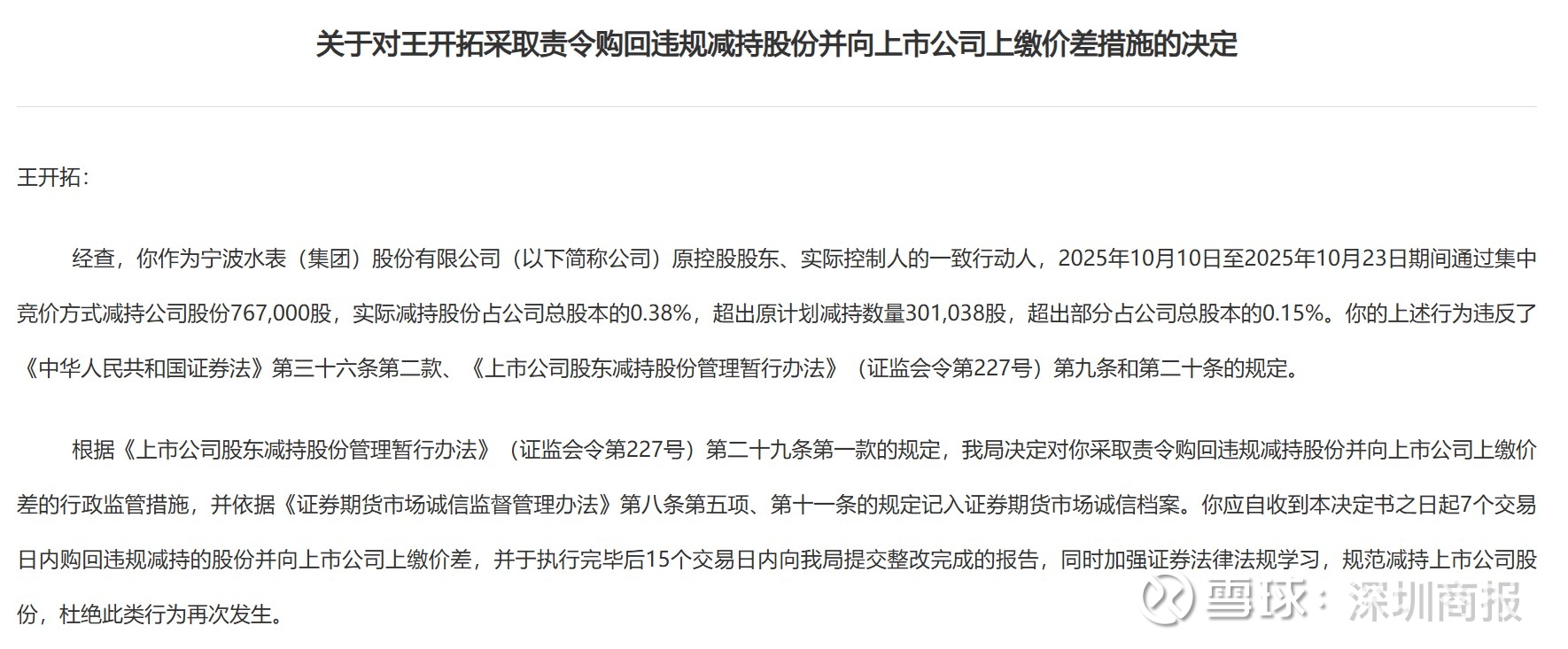 经查,王开拓作为宁波水表(集团)股份有限公司(宁水集团,A股证券代码603700,以下简称公司)原控股股东、实际控制人的一致行动人,2025年10月10日至2025年10月23日期间通过集中竞价方式减持公司股份767,000股,实际减持股份占公司总股本的0.38%,超出原计划减持数量301,038股,超出部分占公司总股本的0.15%。王开拓的上述行为违反了《证券法》第三十六条第二款、《上市公司股东减持股份管理暂行办法》第九条和第二十条的规定。