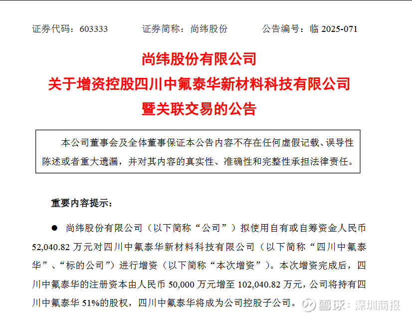 公告显示,尚纬股份拟使用自有或自筹资金人民币52,040.82 万元对中氟泰华进行增资。本次增资完成后,中氟泰华的注册资本由人民币 50,000 万元增至 102,040.82 万元,公司将持有四川中氟泰华 51%的股权,四川中氟泰华将成为公司控股子公司。
