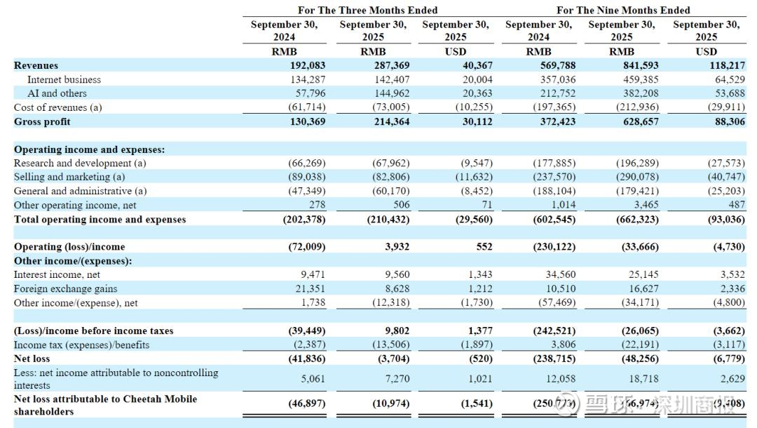 11月26日,猎豹移动发布2025年第三季度财报,截至9月30日,公司第三季度总营业收入为2.87亿元(约合4037万美元),同比增长49.6%;Non-GAAP营业利润为1512万元(212万美元),实现六年来首次经营盈利。