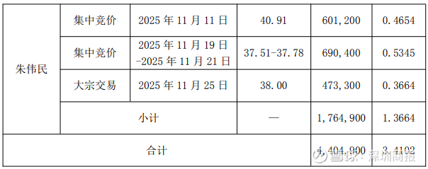 具体来看,2025年11月11日,朱伟华通过集中竞价方式减持493,700股,减持占总股本比例0.3822%,减持均价为40.78元/股;2025年11月18日至2025年11月21日,朱伟华通过集中竞价方式减持797,930股,减持占总股本比例0.6177%,减持均价为37.31元/股~37.75元/股;2025年11月25日,朱伟华通过大宗交易方式减持1,348,370股,减持占总股本比例1.0439%,减持均价为38.00元/股。经计算,朱伟华减持金额约1亿元。