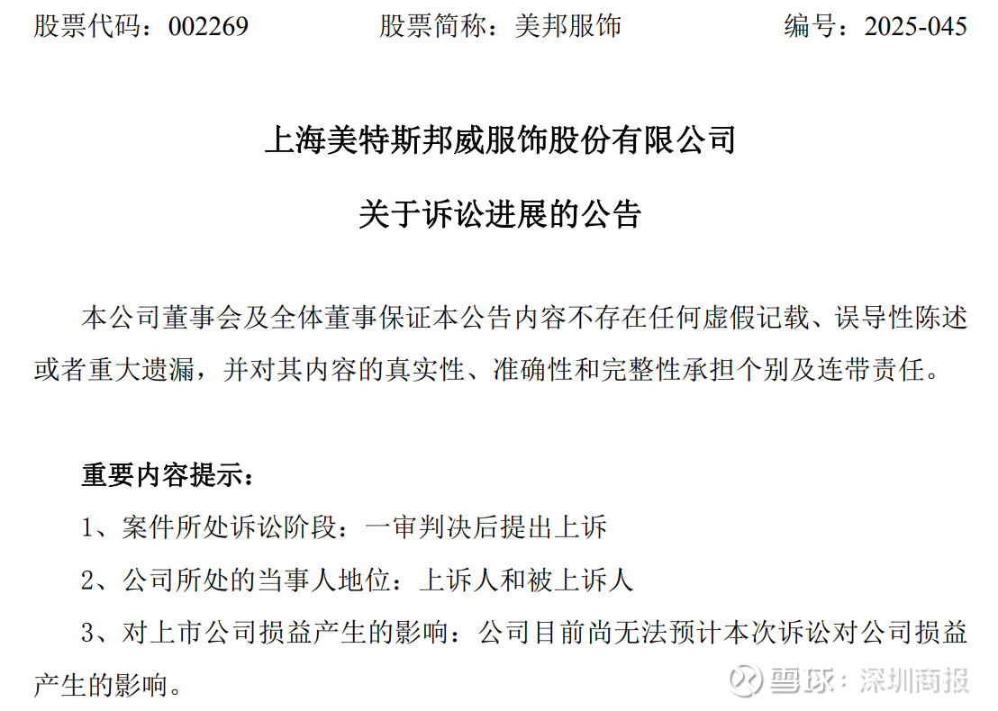 美邦服饰在公告中表示,目前二审受理及具体开庭时间尚未明确,诉讼结果尚存在不确定性,公司暂无法判断本次诉讼进展对公司本期或期后利润的影响。