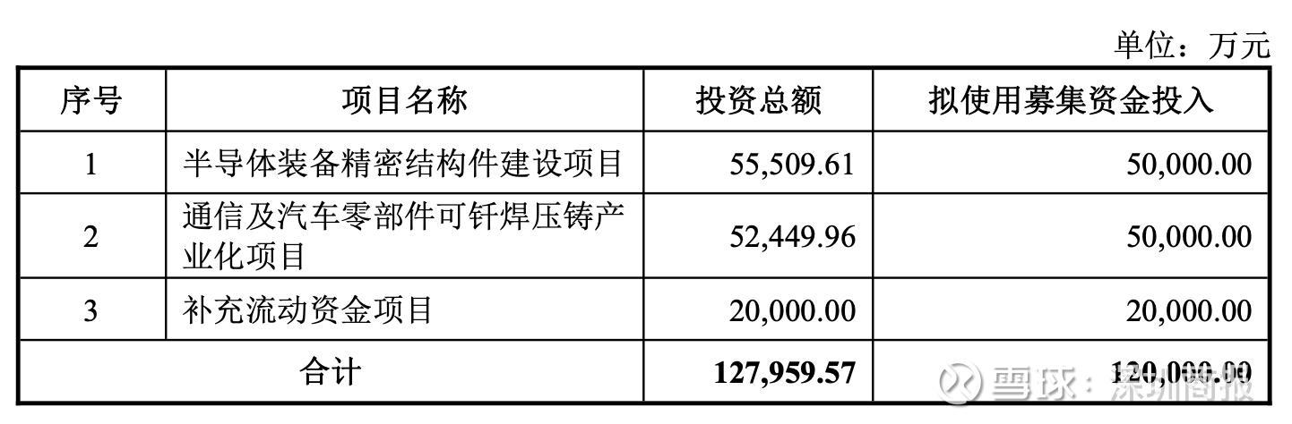 具体来看,半导体装备精密结构件建设项目总投资5.56亿元,其中募集资金投入5亿元。通信汽车零部件可钎焊压铸产业化项目总投资5.24亿元,其中募集资金投入5亿元。另外,公司拟将本次向特定对象发行A股股票募集资金中2亿元用于补充流动资金。